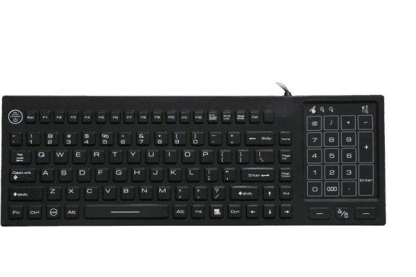 SK318 industrial rigid silicone keyboard, 88 Keys, combo touchpad and number keypad, function keys, ON/OFF switch, USB communication, protection level IP68, washable and antibacterial, for medical application, food industry, harsh condition.