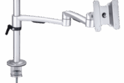 Supporto monitor con uno snodo, doppia estensione, fissaggio con morsetto, regolabile in altezza.