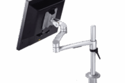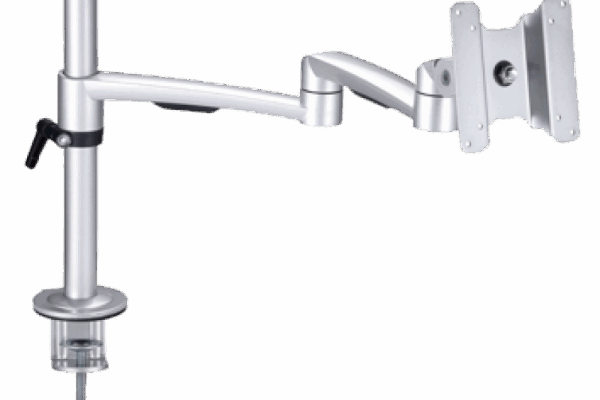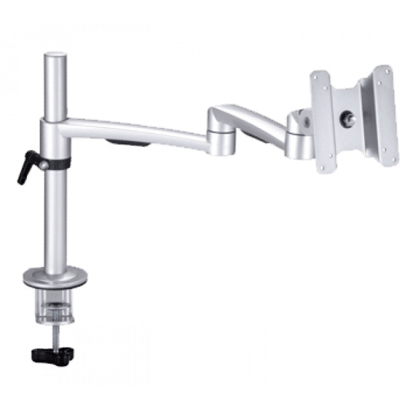 Supporto monitor con uno snodo, doppia estensione, fissaggio con morsetto, regolabile in altezza.