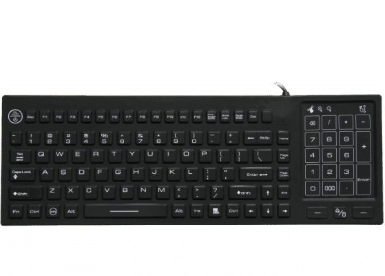 SK318 tastiera industriale in gomma siliconica rigida, 88 tasti con touchpad-tastierino numerico combinati, tasti funzione, tasto ON/OFF, USB, protezione a IP68, antibatterica e lavabile, per ambienti medicali, alimentari, industriali gravosi.